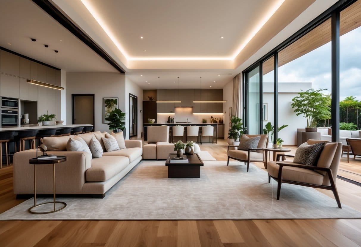 Comfort and beauty work together in every design choice. You select deep sofas with quality cushions, not stiff showpieces. Your materials include soft leathers, natural wood grains, and metals like brushed brass that add warmth.